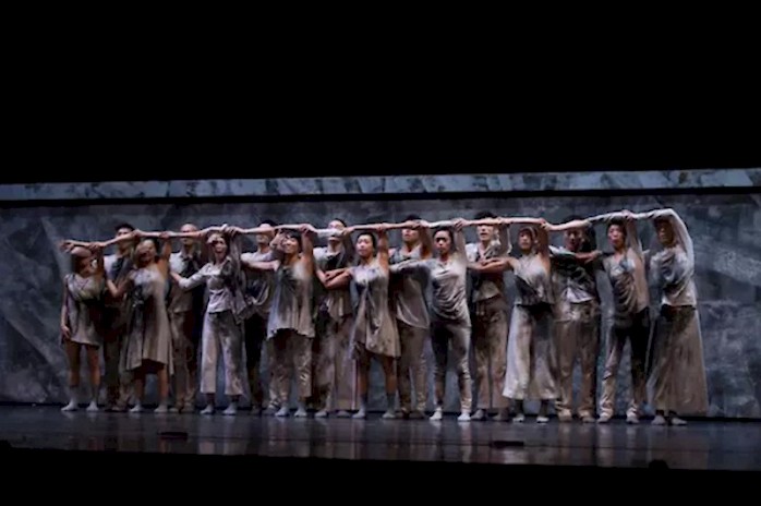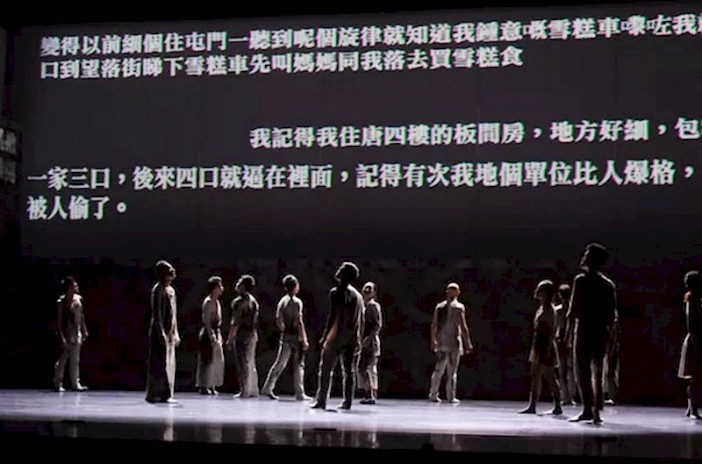 在舞者故事一一讲完之后,有一个很有意思的构图:男女舞者们梅花间竹,一字排开,一个头挨着下一个人的背,如传递能量般,连成像多米诺骨牌的人浪。呼吸、劲力流动,甚至不同的动作原理也在舞蹈身体内部形成张力──在让舞蹈身体“像河一样流动起来”。仿佛隐喻了城市文化随时间流动中重建、变迁、发展,流动到中间,突然有一个舞者下蹲,停顿了几秒,然后再继续接上,我想这大概也隐喻了香港城市的文化断层。在社会急促发展的今天,也许我们真的可以停下来,回响过去,对比现在,思考一下自己和城市的关系。
