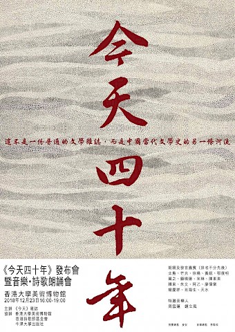 TODAY’s Forty Years: Launch & Poetry Reading December 23, 2018, 5:00 pm Bei Dao Mang Ke Xu Xiao Huang Rui E Fuming Wan Zhi Gu Xiaoyang Song Lin Chen Dongdong Han Dong Zhu Wen A Yi Liu Wai-tong Yang Qingxiang Xiao Haisheng Tian Shui Zhou Yunpeng Zhong Lifeng Ann Mak Dickson Dee