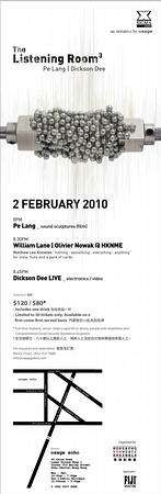 The Listening Room 3 features sound art by Pe Lang (Switzerland), a new work (performed by HKNME) by London-based composer Matthew Lee Knowles, and an electronic/ video performance by famous Hong Kong electronic artist Dickson Dee.